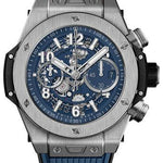 44 mm satin-finished and polished titanium case, satin-finished and polished titanium bezel with 6 h-shaped titanium screws, sapphire crystal with anti-reflective treatment, mat blue skeleton dial, HUB1280 UNICO manufacture self-winding chronograph flyback movement, approximately 72 hours of power reserve, blue structured lined rubber strap, titanium deployant buckle. Water resistant to 100m (10 ATM).