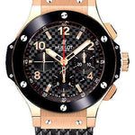 44mm 18k red gold case, black ceramic bezel, black carbon dial, self winding HUB 44 movement with chronograph function, approximately 42 hours of power reserve, black rubber strap with deployant buckle. Water resistant to 100 meters.