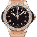 38mm 18K red gold case, 18K red gold bezel set with 126 diamonds (0.87ct), black composite resin lateral inserts and bezel lugs, black dial, quartz HUB 2900 movement, 18K red gold bracelet. Water resistant to 100 meters.