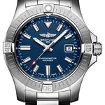 43.00 mm stainless steel case, 12.28 mm thick, screw-locked crown with two gaskets, unidirectional ratcheted bezel, blue dial, Breitling 17 self-winding movement, approximately approx. 38 hrs of power reserve, metal bracelet. Water resistant to 300 m (1,000 ft).