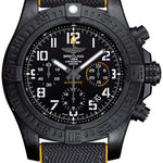 45.00 mm Breitlight case, 16.20 mm thick, screw-locked crown with two gaskets, unidirectional ratcheted bezel, cambered sapphire crystal with glareproof treatment on both sides, volcano black dial, Breitling 01 (Manufacture) self-winding movement, approximately 70 hrs of power reserve, anthracite and yellow military rubber bracelet, pushbutton folding buckle. Water resistant to 100 m (330 ft).
