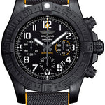 45.00 mm breitlight® case, 16.20 mm thick, screw-locked crown with two gaskets, unidirectional ratcheted bezel, cambered sapphire crystal with glareproof treatment on both sides, volcano black dial, Breitling 01 self-winding movement with calendar via dial aperture and chronograph function, approximately 70 hours of power reserve, anthracite and yellow military rubber strap, pushbutton folding buckle. Water resistant to 100 m (330 ft).