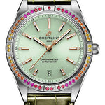 36.0 mm stainless steel (gem-set) case, 10.0 mm thick, non screw-locked crown with two gaskets, unidirectional ratcheted bezel, mint green dial, Breitling 10 self-winding movement, approximately 42 hours of power reserve, green alligator leather strap, folding buckle. Water resistant to 100 m (330 ft).