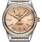 36.00 mm stainless steel and 18K red gold (gem-set) case, non screw-locked crown with two gaskets, unidirectional ratcheted bezel, copper diamond dial, Breitling 10 self-winding movement, approximately approx. 42 hours of power reserve, metal bracelet. Water resistant to 100 m (330 ft).