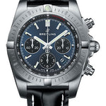 44.00 mm steel case, 16.95 mm thick, screw-locked crown with two gaskets, unidirectional ratcheted bezel, cambered sapphire crystal with glareproof treatment on both sides, blackeye blue dial, Breitling 01 self-winding movement with calendar via dial aperture and chronograph function, approximately 70 hours of power reserve, black croco strap, tang buckle. Water resistant to 500 m (1,650 ft).