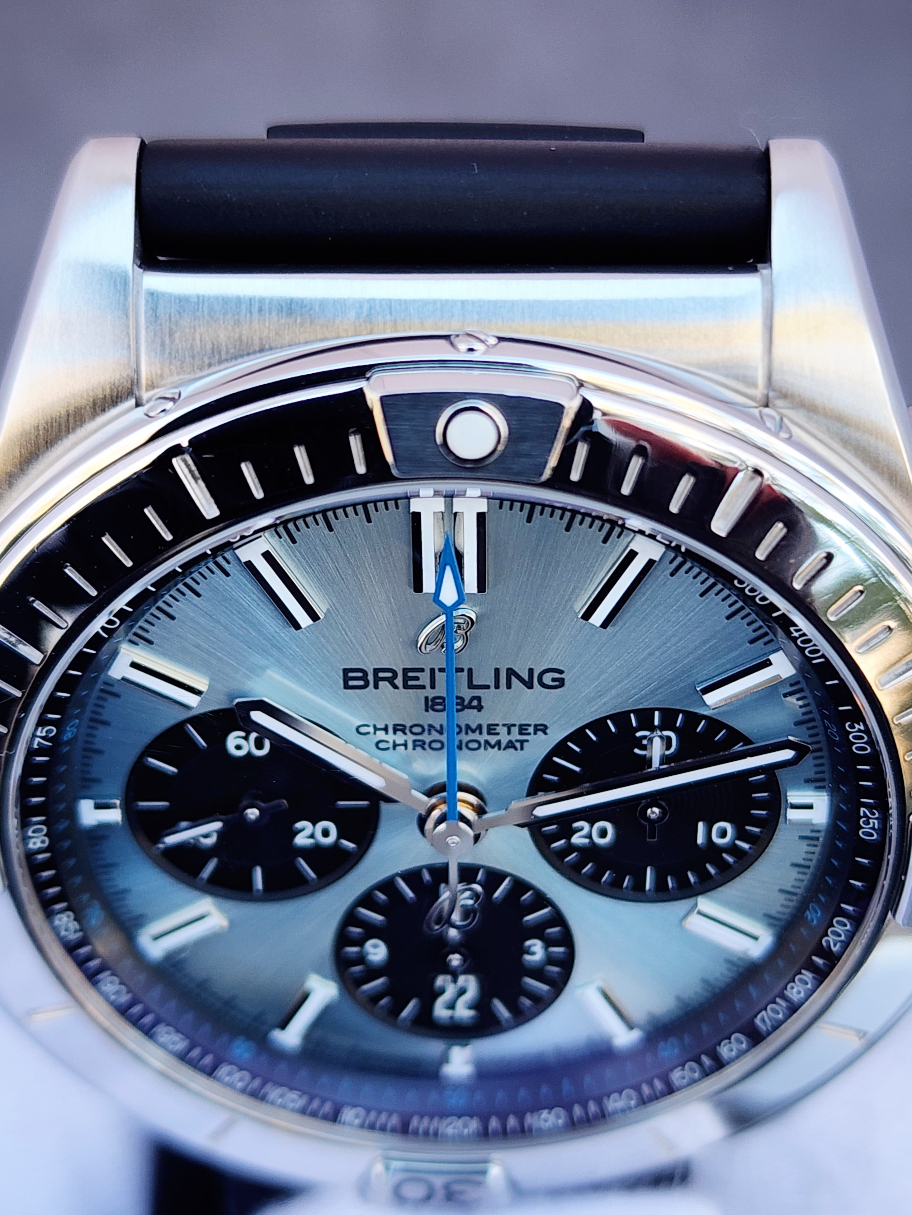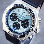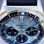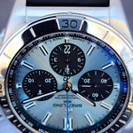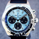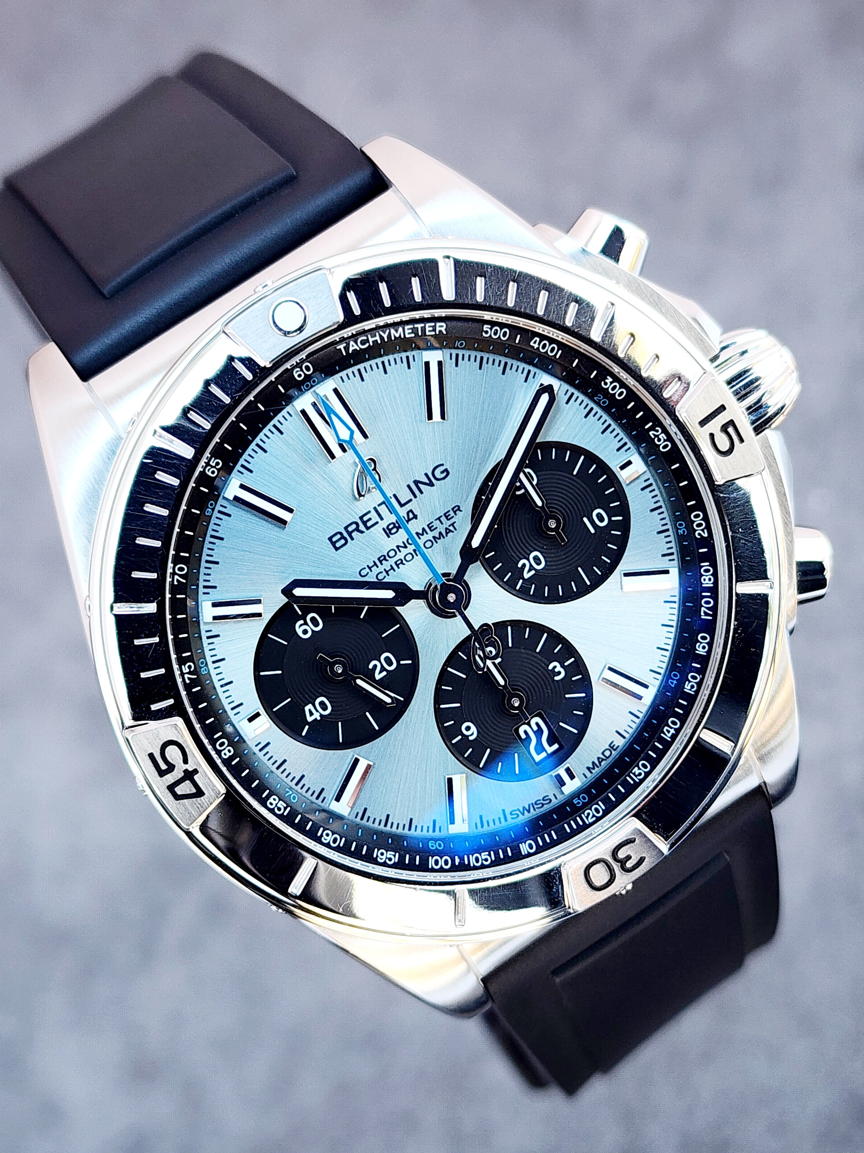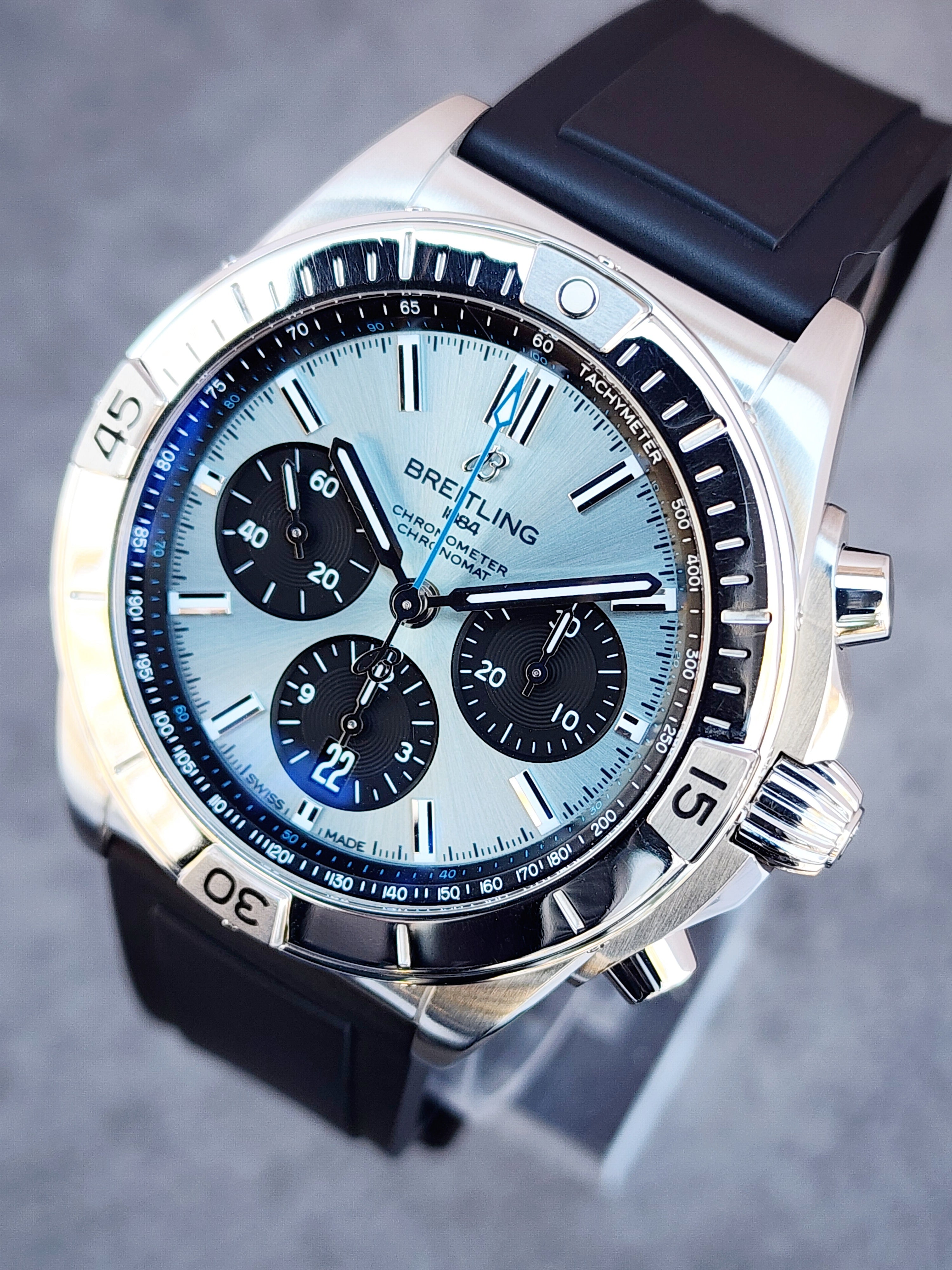 Up for sale is the Breitling Chronomat B10 Platinum Bezel Chronograph PB0134101C1S1 42mm Ice Blue Dial with Breitling box, warranty card, quick start guide. Watch is dated 2021. MSRP $11250. It was recently placed on a timegrapher and is running well. All of our watches are photographed under high intensity light with a macro lens. Any flaws will be significantly magnified. The serial numbers have been blurred for privacy. Timepiece is in excellent, pre-owned condition with minor to no signs of wear and is located in Indiana.