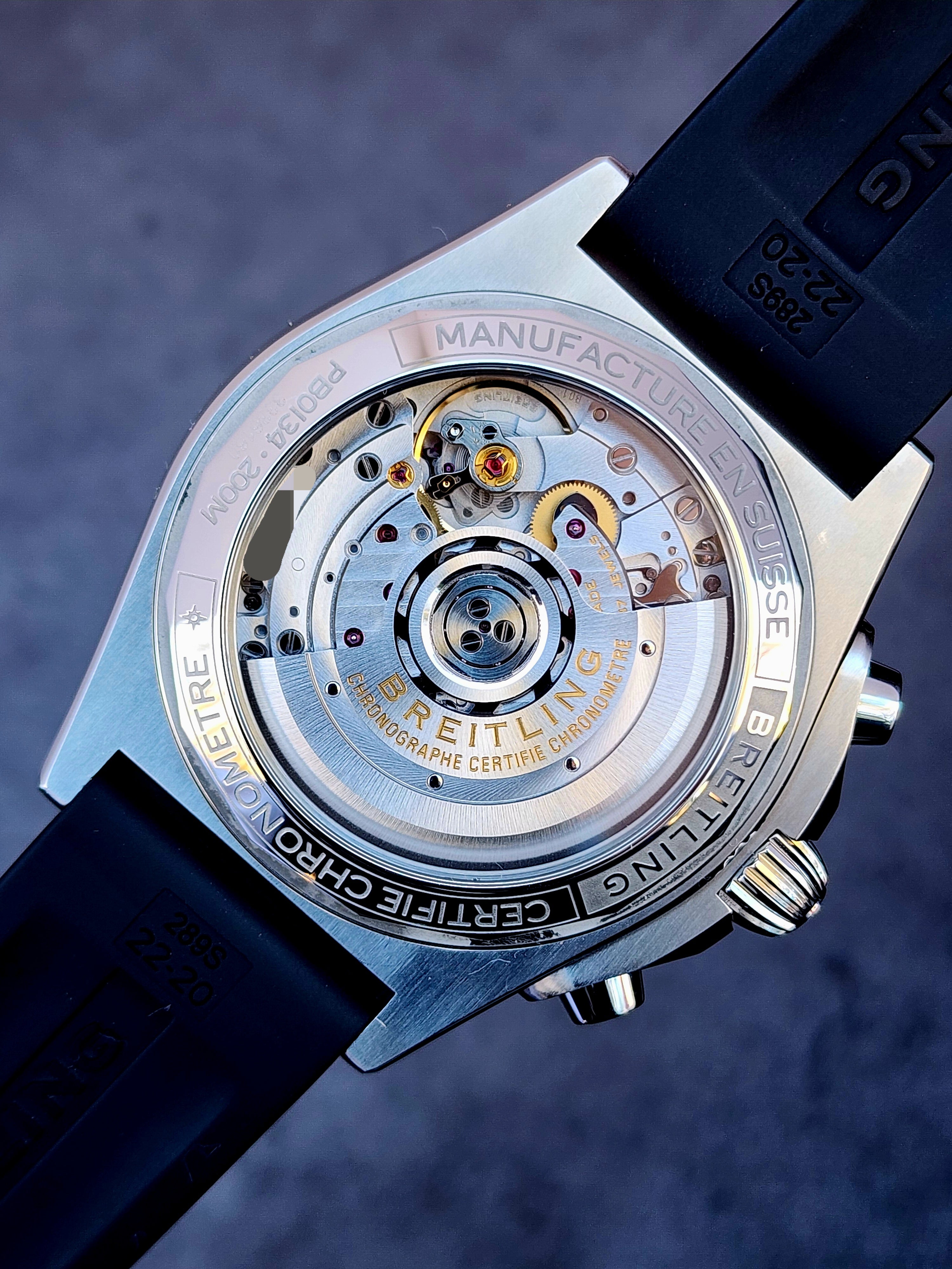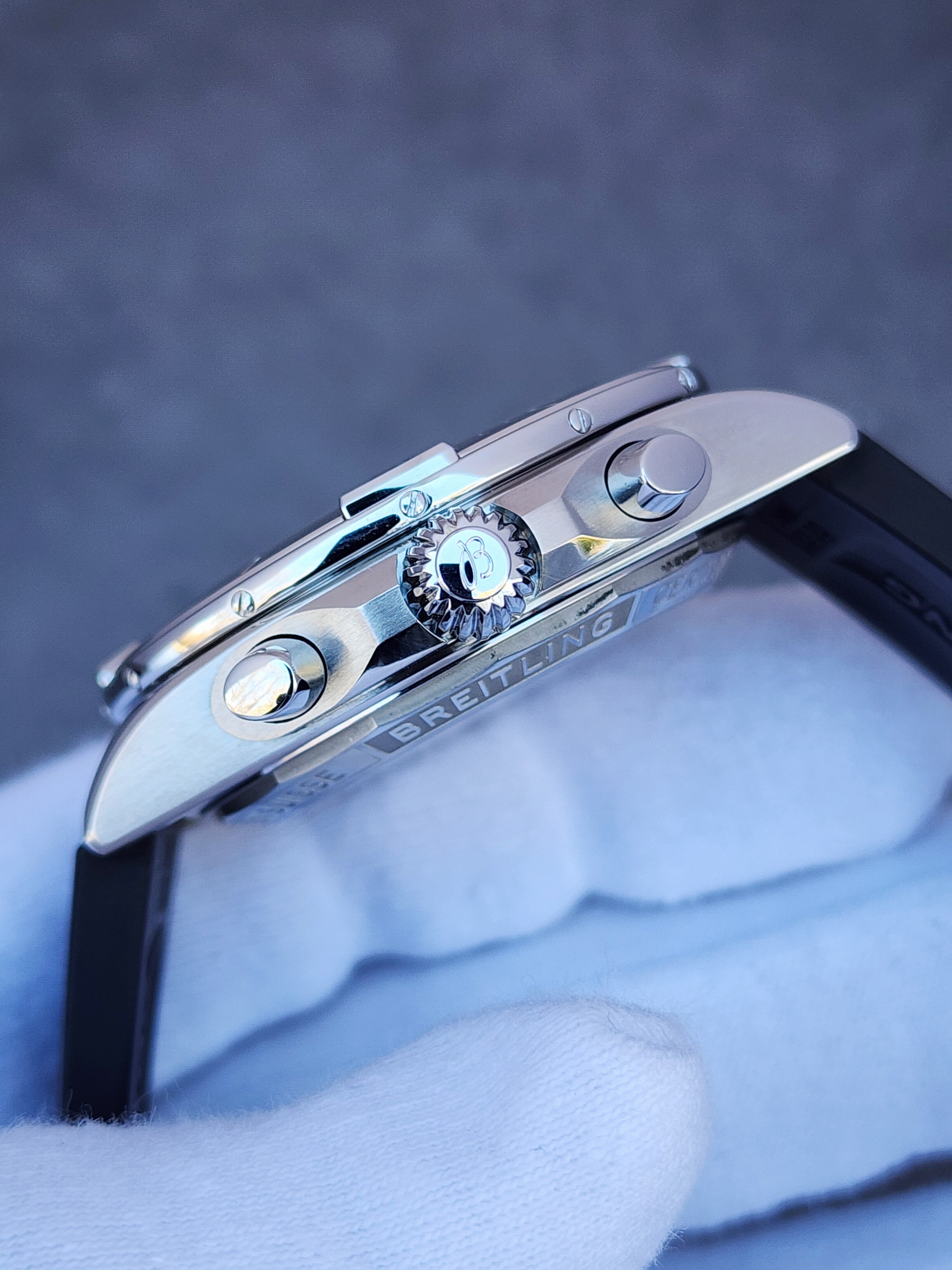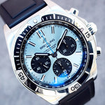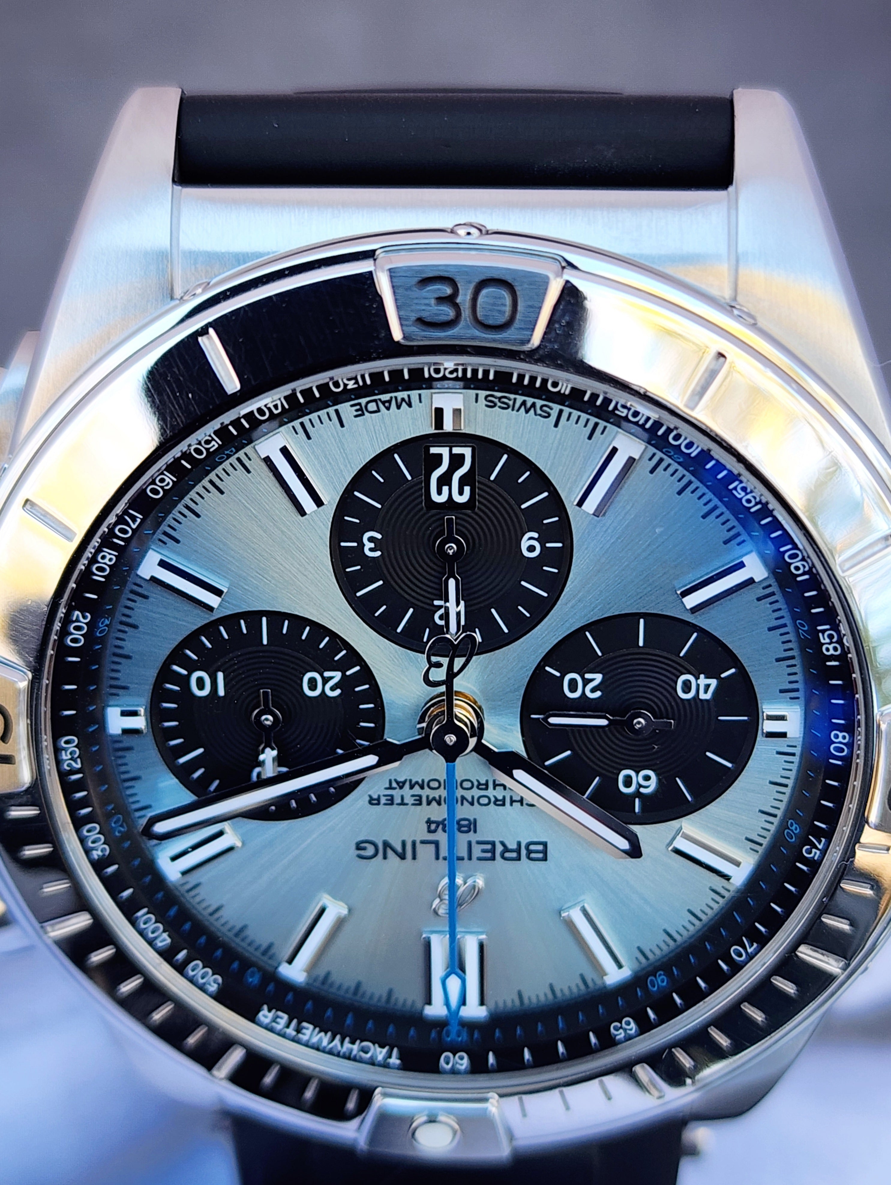Up for sale is the Breitling Chronomat B10 Platinum Bezel Chronograph PB0134101C1S1 42mm Ice Blue Dial with Breitling box, warranty card, quick start guide. Watch is dated 2021. MSRP $11250. It was recently placed on a timegrapher and is running well. All of our watches are photographed under high intensity light with a macro lens. Any flaws will be significantly magnified. The serial numbers have been blurred for privacy. Timepiece is in excellent, pre-owned condition with minor to no signs of wear and is located in Indiana.