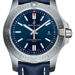 44.00 mm steel case, 11.25 mm thick, screw-locked crown with two gaskets, unidirectional ratcheted bezel, sapphire crystal with glareproof treatment on both sides, mariner blue dial, Breitling 17 self-winding movement with calendar via dial aperture, approximately 38 hours of power reserve, blue leather strap, tang buckle. Water resistant to 200 m (660 ft).