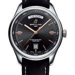 40.00 mm stainless steel case, 11.40 mm thick, non screw-locked crown with two gaskets, cambered sapphire crystal with glareproof treatment on both sides, black dial, Breitling 45 self-winding movement, approximately 38 hours of power reserve, black nubuck strap, folding buckle. Water resistant to 100 m (330 ft).