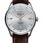 40.00 mm stainless steel case, 11.40 mm thick, non screw-locked crown with two gaskets, cambered sapphire crystal with glareproof treatment on both sides, silver dial, Breitling 45 self-winding movement, approximately 38 hours of power reserve, brown nubuck strap, folding buckle. Water resistant to 100 m (330 ft).