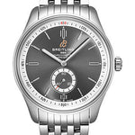 40.00 mm stainless steel case, 11.40 mm thick, non screw-locked crown with two gaskets, cambered sapphire crystal with glareproof treatment on both sides, anthracite dial, Breitling 37 self-winding movement, approximately 38 hours of power reserve, steel bracelet navitimer. Water resistant to 100 m (330 ft).