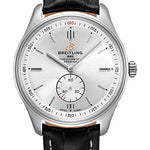 40.00 mm stainless steel case, 11.40 mm thick, non screw-locked crown with two gaskets, cambered sapphire crystal with glareproof treatment on both sides, silver dial, Breitling 37 self-winding movement, approximately 38 hours of power reserve, black croco strap, folding buckle. Water resistant to 100 m (330 ft).