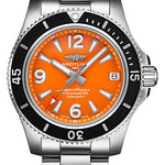 36.00 mm stainless steel case, 11.25 mm thick, screw-locked crown with two gaskets, unidirectional ratcheted bezel, cambered sapphire crystal with glareproof treatment on both sides, orange dial, Breitling 17 self-winding movement, approximately approx. 38 hrs of power reserve, metal bracelet. Water resistant to 200 m (660 ft).
