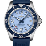 36.00 mm steel case, 11.25 mm thick, screw-locked crown with two gaskets, unidirectional ratcheted bezel, cambered sapphire crystal with glareproof treatment on both sides, blue dial, Breitling 17 self-winding movement, approximately 38 hrs of power reserve, blue diver pro III strap, tang buckle. Water resistant to 200 m (660 ft).