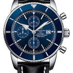 46.00 mm stainless steel case, 16.35 mm thick, screw-locked crown with two gaskets, unidirectional ratcheted rotating bezel, cambered sapphire crystal with glareproof treatment on both sides, gun blue dial, Breitling 13 selfwinding movement, approximately 48 hrs of power reserve, black leather strap, folding buckle. Water resistant to 200 m (660 ft).