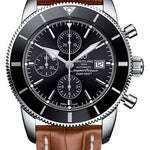 46.00 mm stainless steel case, 16.35 mm thick, screw-locked crown with two gaskets, unidirectional ratcheted rotating bezel, cambered sapphire crystal with glareproof treatment on both sides, volcano black dial, Breitling 13 selfwinding movement, approximately 48 hrs of power reserve, gold croco strap, folding buckle. Water resistant to 200 m (660 ft).