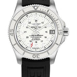 36.00 mm stainless steel case, screw-locked crown with two gaskets, unidirectional ratcheted bezel with white rubber insert, cambered sapphire crystal with glareproof treatment on both sides, Hurricane white dial, selfwinding mechanical Breitling 17 movement with date display, 40 hours of power reserve, black Diver Pro III strap with tang-type buckle. Water resistant to 200 m (660 ft).