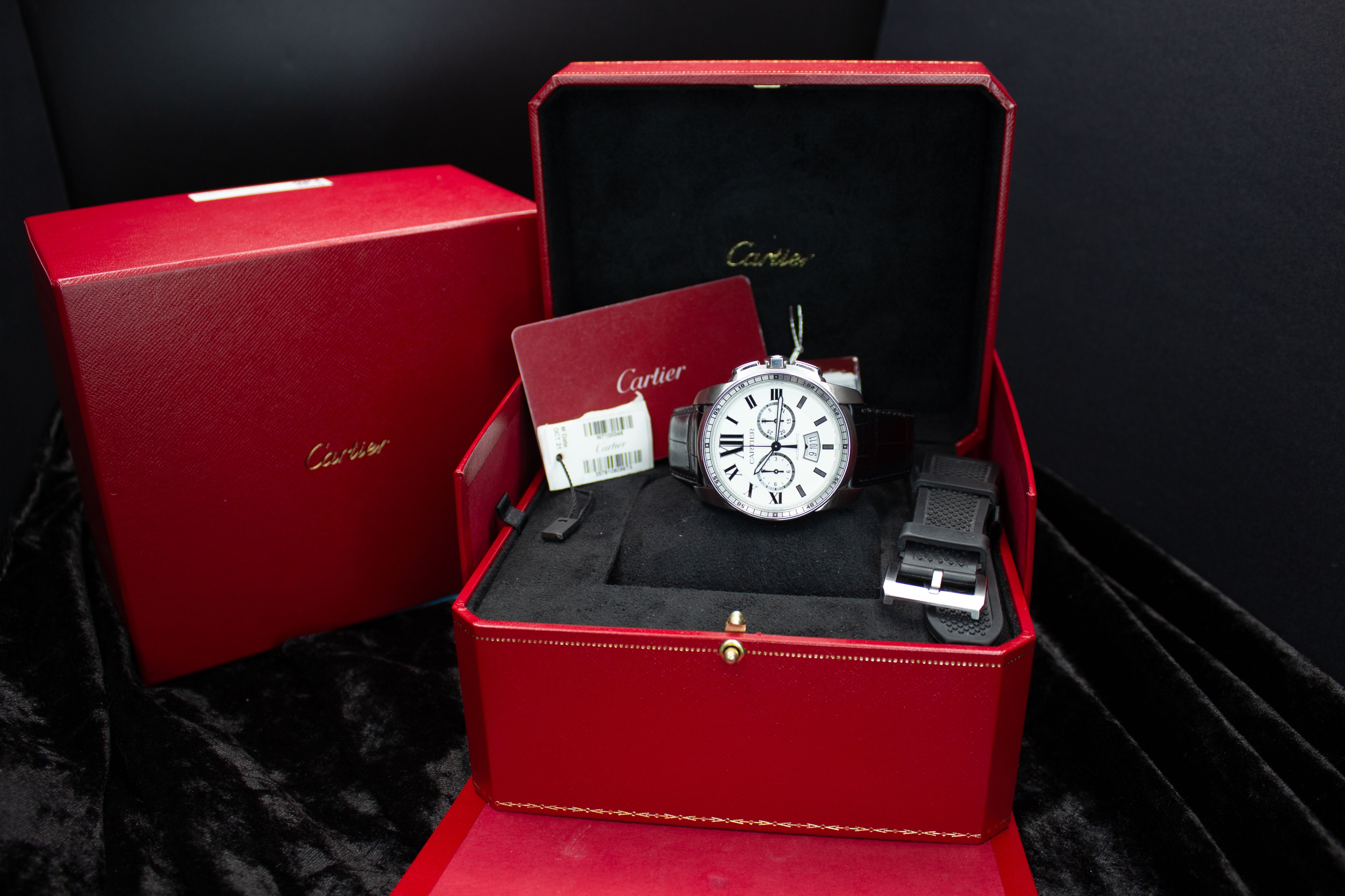 Up for sale is the Cartier Calibre de Cartier Chronograph W7100046 42MM Steel Silver Dial with Warranty card, retail tag, rubber strap, and is double boxed. Watch is dated 2019. Watch warranty is good through 2027. MSRP $10,200. It was recently placed on a timegrapher and is running well. All of our watches are photographed under high intensity light with a macro lens. Any flaws will be significantly magnified. The serial numbers have been blurred for privacy. Timepiece is in excellent condition showing little to no signs of wear. Timepiece is located in Indiana.