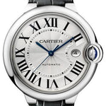 42.1 mm by 13 mm thick stainless steel case, stainless steel fluted crown set with a blue synthetic spinel cabochon, sapphire crystal, silver dial with 1 Roman numeral and blued steel hands, caliber Cartier 049 automatic movement, black alligator strap. Water resistant to 30 meters.