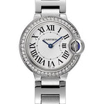 28mm stainless steel case, 9.35mm thick, crown set with a synthetic blue cabochon, bezel set with 42 diamonds (0.52 ct), sapphire crystal, silvered opaline dial with blued-steel sword-shaped hands, quartz movement, stainless steel bracelet. Water resistant to 30 meters.