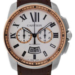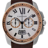 42 mm by 12.6 mm thick stainless steel and 18K pink gold case, heptagonal crown set with a synthetic spinel cabochon, 18K pink gold bezel with rail track, sapphire crystal, silver dial with partly snailed opaline, pink gold finish chamfers and luminescent sword shaped black oxidized steel hands, caliber 1904-CH MC automatic movement with chronograph and calendar aperture at 6 o'clock, brown alligator strap, 18K pink gold ardillon buckle double deployant. Water resistant to 30 meters.