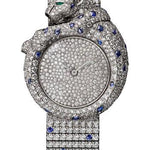 43.13mm x 34.28mm 18K white gold case with 595 brilliant-cut diamonds totalling 5 carats, 39 sapphire spots, 2 emerald eyes totalling .04 carats, onyx nose of .01 carats,, 13.48mm thick, sapphire crystal, diamonds dial with 298 diamonds totalling 1.04 carats, and rhodium-finish steel sword-shaped hands, quartz movement, 18K white gold bracelet with 498 diamonds totalling 12 carats and 22 sapphires. Water resistant to 30 meters.