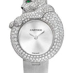 43 mm 18K rhodiumized white gold case set with 617 brilliant-cut diamonds, dial with translucent lacquered lacquered silvered sunray effect, quartz movement, light gray toile brossee fabric strap, double adjustable 18K rhodiumized white gold folding buckle. Water resistant to 30 meters (100 feet).