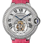 39mm 18K white gold case set with 131 brilliant-cut diamonds (1.83K), 12.9mm thick, sapphire back, fluted crown with a sapphire cabochon, 18K white gold bezel set with 131 brilliant-cut diamonds (1.83K), silver dial with 156 brilliant-cut diamonds (0.43k), caliber 9452 MC manual-winding movement, approximately 50 hours of power reserve, fuchsia alligator skin strap, 18K white gold buckle set with 43 diamonds (0.42K). Water resistant to 30 meters.