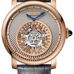 45mm 18K pink gold case, 15.1mm thick, sapphire back, 18K pink gold beaded crown with a blue sapphire cabochon, sapphire crystal, gray dial with 18K white gold sunray guilloche and blued-steel sword-shaped hands, caliber 9459 MC automatic movement with flying tourbillon and perpetual calendar, approximately 50 hours of power reserve, gray alligator strap, 18K pink golddouble adjustable buckle with double adjustable folding. Water resistant to 30 meters.