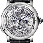 45mm platinum case, 5.49mm thick, sapphire back, beaded platinum crown set with a blue sapphire cabochon, sapphire crystal, silver dial with brass sunray-brushed and blued-steel apple-shaped, baton or hammer-shaped hands, caliber 9406 MC self-winding movement with minute repeater and flying tourbillon, perpetual calendar and skeleton complication, approximately 50 hours of power reserve, black alligator skin strap, 18K white gold double adjustable folding buckle. Water resistant to 30 meters.