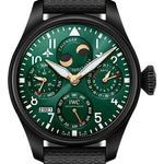 46.5 mm ceramic case, 15.5 mm thick, see-through sapphire glass back, screw in crown, convex sapphire glass crystal with antireflective coating on both sides, green dial, calibre 52615 automatic movement with date, day, month, perpetual calendar, year indicator, hours, minutes, small seconds, moonphase, power reserve indicator, approximately 168 hours of power reserve, black calfskin strap. Water resistant to 6 bar.