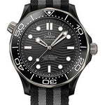 43.5 mm black ceramic case with helium escape valve, transparent back, bezel with a white enamel diving scale, domed scratch-resistant sapphire crystal anti-reflective treatment on both sides, brushed black ceramic [ZrO2] dial with laser-engraving to create raised waves, Caliber Omega 8806 self-winding movement with a co-axial escapement, chronometer, approximately 55 hours of power reserve, 5-stripe black and grey NATO strap. Water resistant to 30 bar (300 metres / 1000 feet).