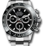 40mm polished 904L stainless steel case, screw-down back and push buttons, screw-down crown and push buttons with Triplock triple waterproofness, black monobloc ceramic Cerachrom bezel with engraved tachymetric scale, scratch-resistant sapphire crystal, black lacquer dial, 18K white gold applied applique hour markers with Chromalight, grey snailed counters, automatic movement with chronograph central second hand, 30-minute counter at 3 o'clock, and 12-hour counter at 9 o'clock, approximately 72 hours of power reserve, 904L stainless steel Oyster bracelet with solid links, folding Oysterlock buckle with Easylink 5mm comfort extension link. Waterproof to 100 meters. Prices of Rolex Daytona Watch continue to rise due to very limited production levels. Introduced at Baselworld 2016 Website.