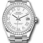 31mm 18K white gold case with monobloc middle case, screw-down back, screw-down crown, bezel set with diamonds, scratch-resistant double anti-reflective sapphire crystal with cyclops lens over the date, white dial, Roman numerals, Rolex calibre 2236 self-winding movement with rapid setting instantaneous date, approximately 55 hours of power reserve, 18K white gold President bracelet with semi-circular three-piece links, concealed folding Crownclasp buckle. Waterproof to 100 meters.
