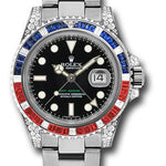 40mm 18K white gold case set with 76 diamonds, 18K white gold bezel set with 23 diamonds, 18 sapphires, and 18 rubies, 24 hour hand, independent 12 hour hand, black dial with date, and 18K white gold Oyster Fliplock bracelet.