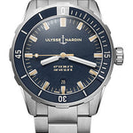 42 mm stainless steel case, blue dial, Caliber UN-816 self-winding movement with date, approximately 42 hours of power reserve, steel bracelet, folding buckle. Water resistant to 300 m.