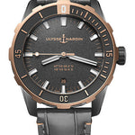 42mm stainless steel case, rose gold bezel, sapphire crystal, grey dial, Caliber UN-816 self winding movement with hours, minutes, seconds, dateescapement wheel & anchor in silicium, approximately 42 hours of power reserve, dark grey leather strap, pin buckle. Water resistant to 300 m.