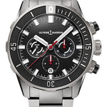 44 mm titanium case, black dial, Caliber UN-150 self-winding movement with chronograph, approximately 48 hours of power reserve, steel bracelet. Water resistant to 300 m.