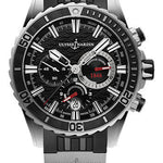 44mm stainless steel case, screw-down security crown crown, rubberized black unidirectional rotating bezel, sapphire crystal, black dial, Caliber UN-150 Self-winding movement with chronograph function, 30-minutes, 12-hours and small seconds registers, date, rubber strap with titanium elements, deployant buckle.