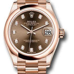 31mm 18K Everose gold case, screw-down crown with twinlock double waterproofness system, domed bezel, scratch-resistant sapphire crystal with cyclops lens over the date, chocolate dial, diamond hour markers, Rolex calibre 2236 automatic movement with center hour, minute and seconds hands, instantaneous date with rapid setting, and stop-seconds for precise time setting, approximately 55 hours of power reserve, 18K Everose gold President bracelet with semi-circular three-piece links, concealed folding Crownclasp buckle. Waterproof to 100 meters.