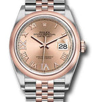 36mm Everose Rolesor case with Oystersteel monobloc middle case, screw-down steel back, screw-down 18K Everose crown, 18K Everose domed bezel, rose dial, Roman numerals with diamond set 6 and 9, Rolex calibre 3235 self-winding movement with date at 3 o'clock, approximately 70 hours of power reserve, Everose Rolesor Jubilee bracelet with five-piece links, folding Oysterclasp buckle with Easylink 5mm comfort extension link. Waterproof to 100 meters. Redesigned for Baselworld 2018 with updated case sides, lugs, and calibre 3235 movement.