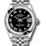 31mm white Rolesor case comprised of Oystersteel and 18K white gold, screw-down back, screw-down crown with twinlock double waterproofness system, 18K white gold domed bezel set with 24 diamonds, scratch-resistant sapphire crystal with cyclops lens over the date, black dial, Roman numerals, Rolex calibre 2236 perpetual self-winding movement with date at 3 o'clock, approximately 55 hours of power reserve, Oystersteel Jubilee bracelet with five-piece links, concealed folding Crownclasp buckle. Waterproof to 100 meters.