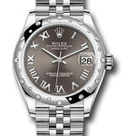31mm white Rolesor case comprised of Oystersteel and 18K white gold, screw-down back, screw-down crown with twinlock double waterproofness system, 18K white gold domed bezel set with 24 diamonds, scratch-resistant sapphire crystal with cyclops lens over the date, dark grey dial, Roman numerals, Rolex calibre 2236 perpetual self-winding movement with date at 3 o'clock, approximately 55 hours of power reserve, Oystersteel Jubilee bracelet with five-piece links, concealed folding Crownclasp buckle. Waterproof to 100 meters.