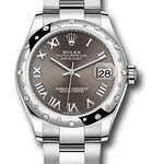 31mm white Rolesor case comprised of Oystersteel and 18K white gold, screw-down back, screw-down crown with twinlock double waterproofness system, 18K white gold domed bezel set with 24 diamonds, scratch-resistant sapphire crystal with cyclops lens over the date, dark grey dial, Roman numerals, Rolex calibre 2236 perpetual self-winding movement with date at 3 o'clock, approximately 55 hours of power reserve, Oystersteel Oyster bracelet with flat three-piece links, concealed folding Oysterclasp buckle. Waterproof to 100 meters.