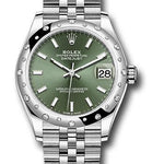 31mm white Rolesor case comprised of Oystersteel and 18K white gold, screw-down back, screw-down crown with twinlock double waterproofness system, 18K white gold domed bezel set with 24 diamonds, scratch-resistant sapphire crystal with cyclops lens over the date, mint green dial, index hour markers, Rolex calibre 2236 perpetual self-winding movement with date at 3 o'clock, approximately 55 hours of power reserve, Oystersteel Jubilee bracelet with five-piece links, concealed folding Crownclasp buckle. Waterproof to 100 meters.