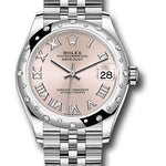 31mm white Rolesor case comprised of Oystersteel and 18K white gold, screw-down back, screw-down crown with twinlock double waterproofness system, 18K white gold domed bezel set with 24 diamonds, scratch-resistant sapphire crystal with cyclops lens over the date, pink dial, Roman numerals, Rolex calibre 2236 perpetual self-winding movement with date at 3 o'clock, approximately 55 hours of power reserve, Oystersteel Jubilee bracelet with five-piece links, concealed folding Crownclasp buckle. Waterproof to 100 meters.