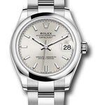 31mm Oystersteel case, screw-down back, screw-down crown with twinlock double waterproofness system, domed bezel, scratch-resistant sapphire crystal with cyclops lens over the date, silver dial, index hour markers, Rolex calibre 2236 perpetual self-winding movement with date at 3 o'clock, approximately 55 hours of power reserve, Oystersteel Oyster bracelet with flat three-piece links, concealed folding Oysterclasp buckle. Waterproof to 100 meters.