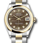 31mm yellow Rolesor case comprised of Oystersteel and 18K yellow gold, screw-down back, screw-down crown with twinlock double waterproofness system, 18K yellow gold domed bezel, scratch-resistant sapphire crystal with cyclops lens over the date, dark mother-of-pearl dial, diamond hour markers, Rolex calibre 2236 perpetual self-winding movement with date at 3 o'clock, approximately 55 hours of power reserve, yellow Rolesor Oyster bracelet made from a combination of 904L steel and 18K yellow gold with flat three-piece links, folding Oysterclasp buckle with Easylink 5mm comfort extension link. Waterproof to 100 meters. Baselworld 2019 release.