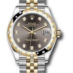 31mm yellow Rolesor case comprised of Oystersteel and 18K yellow gold, screw-down back, screw-down crown with twinlock double waterproofness system, 18K yellow gold domed bezel set with diamonds, scratch-resistant sapphire crystal with cyclops lens over the date, dark grey dial, diamond hour markers, Rolex calibre 2236 perpetual self-winding movement with date at 3 o'clock, approximately 55 hours of power reserve, yellow Rolesor Jubilee bracelet with semi-circular three-piece links, concealed folding Crownclasp buckle. Waterproof to 100 meters. Baselworld 2019 release.