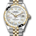 31mm yellow Rolesor case comprised of Oystersteel and 18K yellow gold, screw-down back, screw-down crown with twinlock double waterproofness system, 18K yellow gold domed bezel set with diamonds, scratch-resistant sapphire crystal with cyclops lens over the date, mother-of-pearl dial, diamond hour markers, Rolex calibre 2236 perpetual self-winding movement with date at 3 o'clock, approximately 55 hours of power reserve, yellow Rolesor Jubilee bracelet with semi-circular three-piece links, concealed folding Crownclasp buckle. Waterproof to 100 meters. Baselworld 2019 release.